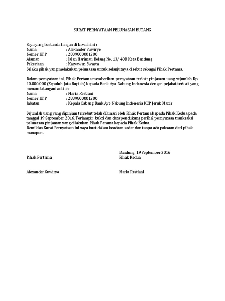 Contoh Surat Kuasa Pelunasan Hutang Bank Backup Gambar from i1.wp.com Pembuatan surat kontrak kerja proyek juga bertujuan supaya kedua belah pihak mengetahui hak dan kewajibannya. Berikut contoh surat pernyataan hutang. Nah, itulah informasi dan contoh seputar surat perjanjian hutang piutang. Namun, apabila di kemudian hari ternyata pihak pertama tidak mampu membayar hutang tersebut sesuai tenggat waktu, maka pihak kedua memiliki hak penuh atas kepemilikan. Tak lupa, lakukan pengambilan foto untuk memperkuat bukti dokumentasi. Namun di bawah ini adalah beberapa contoh surat pernyataan hutang yang bisa anda jadikan bahan referensi. S e b e l u m d o w l o a d b a c a d u l u : Surat pernyataan hutang surat untuk pernyataan utang digunakan menyatakan utang tertentu, baik pribadi maupun usaha.